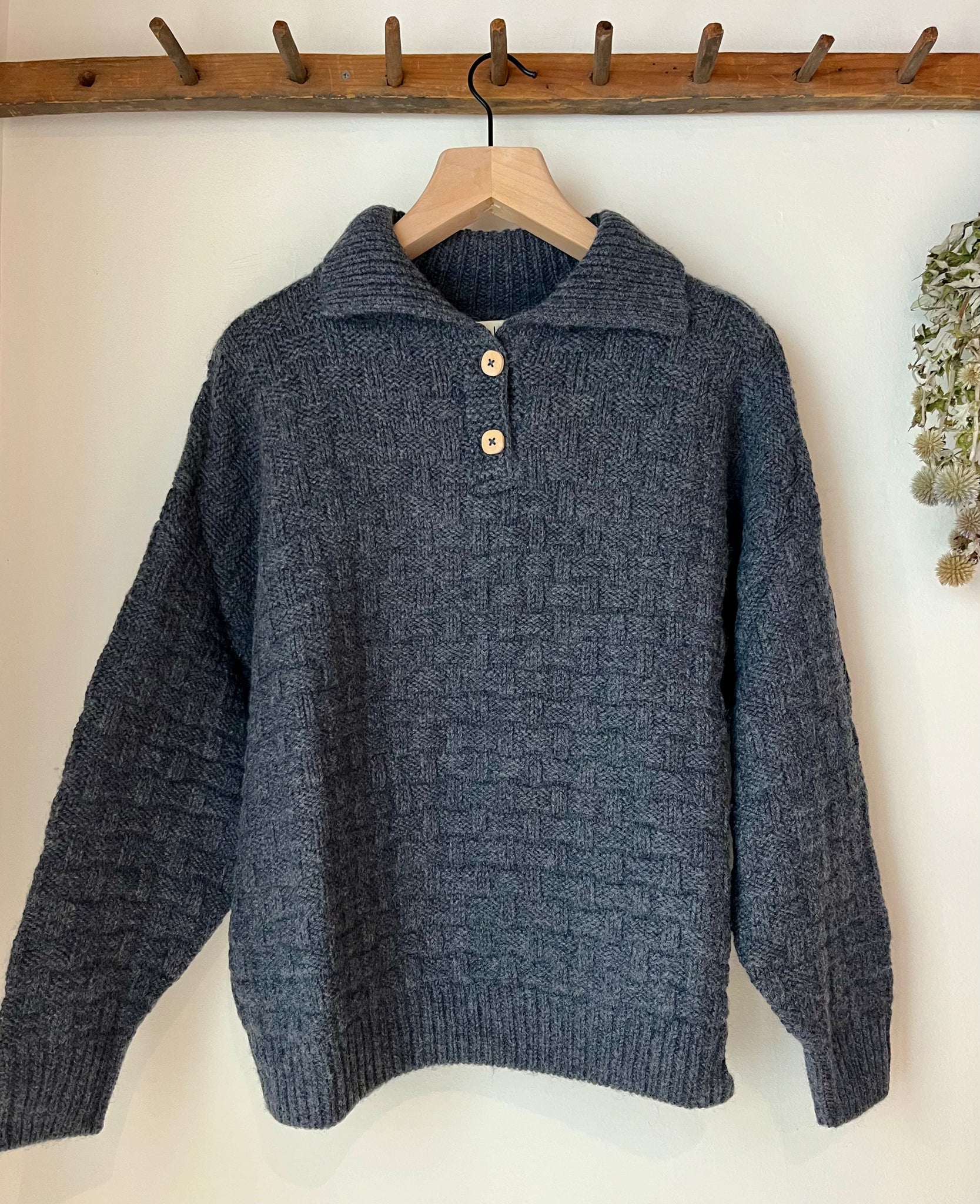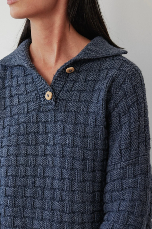 Oversized popover sweater with a rib collar and 2 wood buttons. A lattice stitch gives an overall texture to this mid weight sweater. The Denim color is overdyed with a wool dye so the cotton fibers remain white, creating a heathered effect.